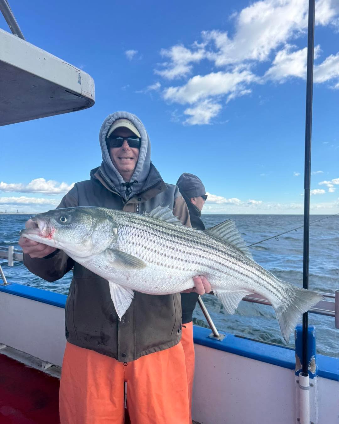 Sunday Striper report .The winds started off blowing out of the west. Than as the day went on the gales of November came on blowing 30 plus out of the west. We had a great crowd out that fished hard. We managed all most a boat limit. We had fish from 25 to 38 inches. Sailing dail